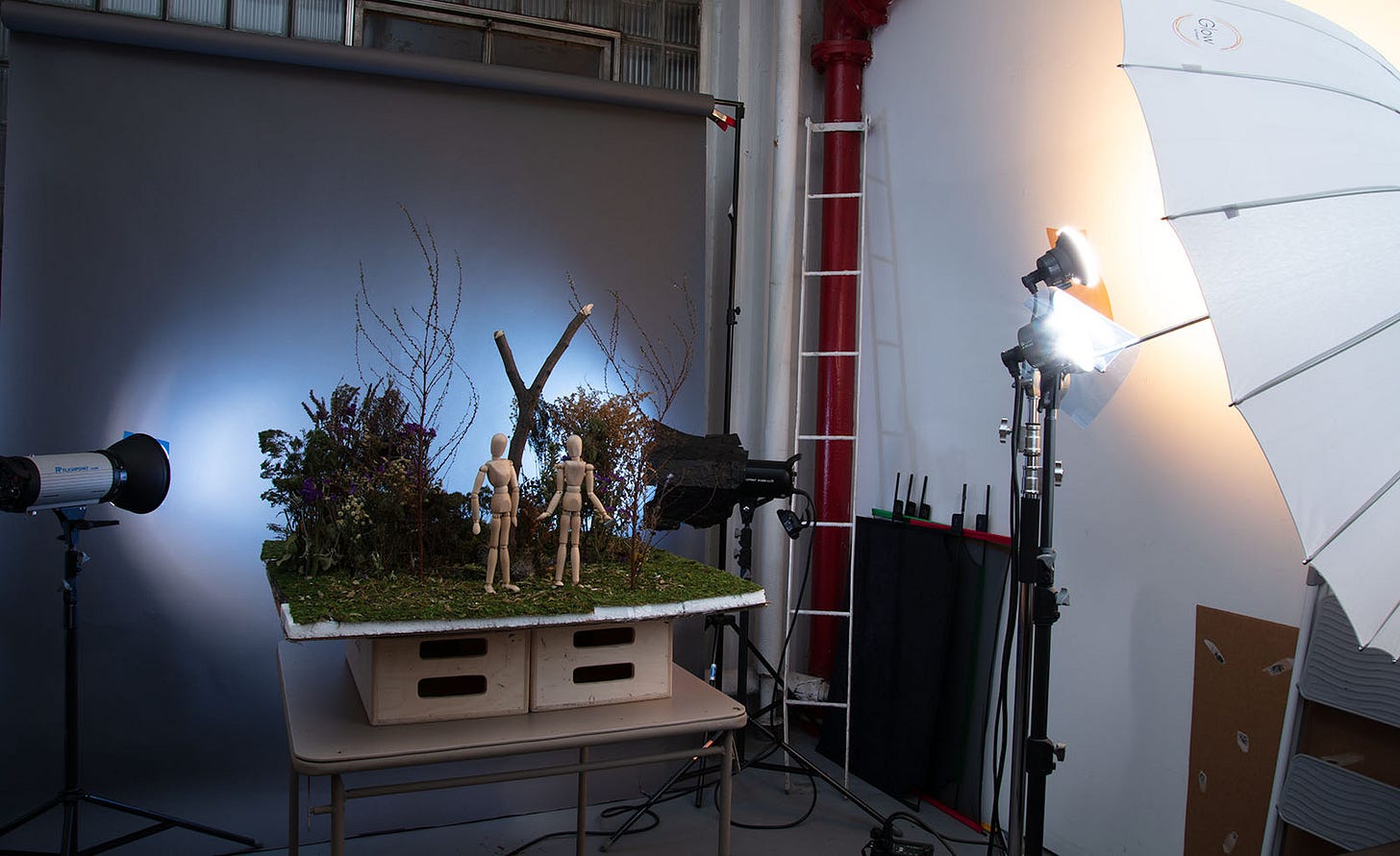 My next task, before casting for models, would be to construct the “Garden of Eden” miniature set. This would prove to be much more of a challenge than I anticipated. All of my previous projects had been interior scenes. Making a convincing exterior exterior set was tricky, all that detail! I made a habit of buying as many small flowers and leafy plants as I could at the various flower stands on the way to my studio almost every day. It wasn’t long before I had enough of an inventory to begin constructing my very own “Garden of Eden”. But I had to double the scale I was accustomed to employing in order achieve the detail I felt necessary.