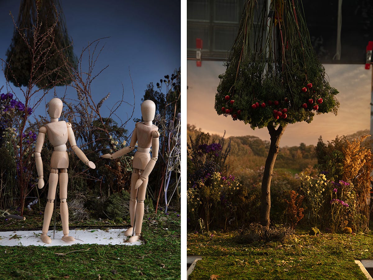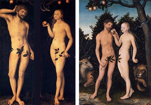 Things began well enough. I always start with a mood board, and for inspiration I turned to one of my favorite sources–the old masters of Western art. I have always loved the Garden of Eden compositions by Lucas Cranach the Elder. The biblical characters of Adam and Eve felt right for my purposes, at least as a point of departure. In addition, Ewa was a serious student of the Hebrew Bible (Old Testament), so it seemed fitting for that reason as well. The title for the series is The Great Reconciliation. I came up with this title before I discovered the Leonard Cohen quote at the bottom of this text, but I love the connection.